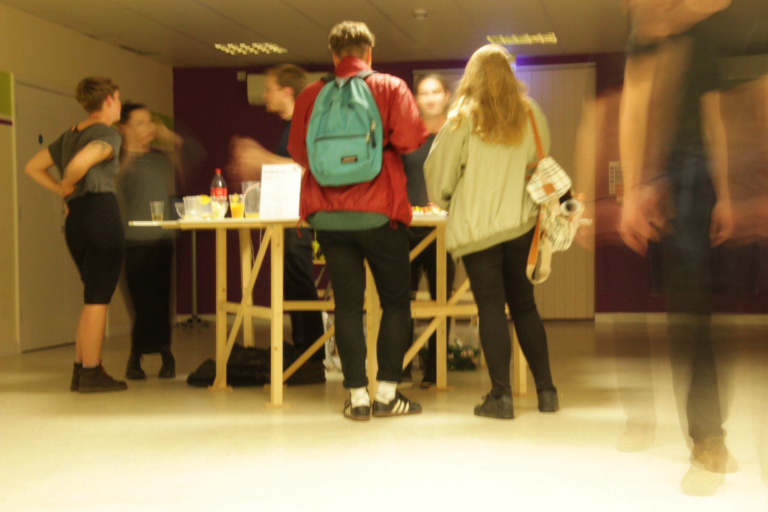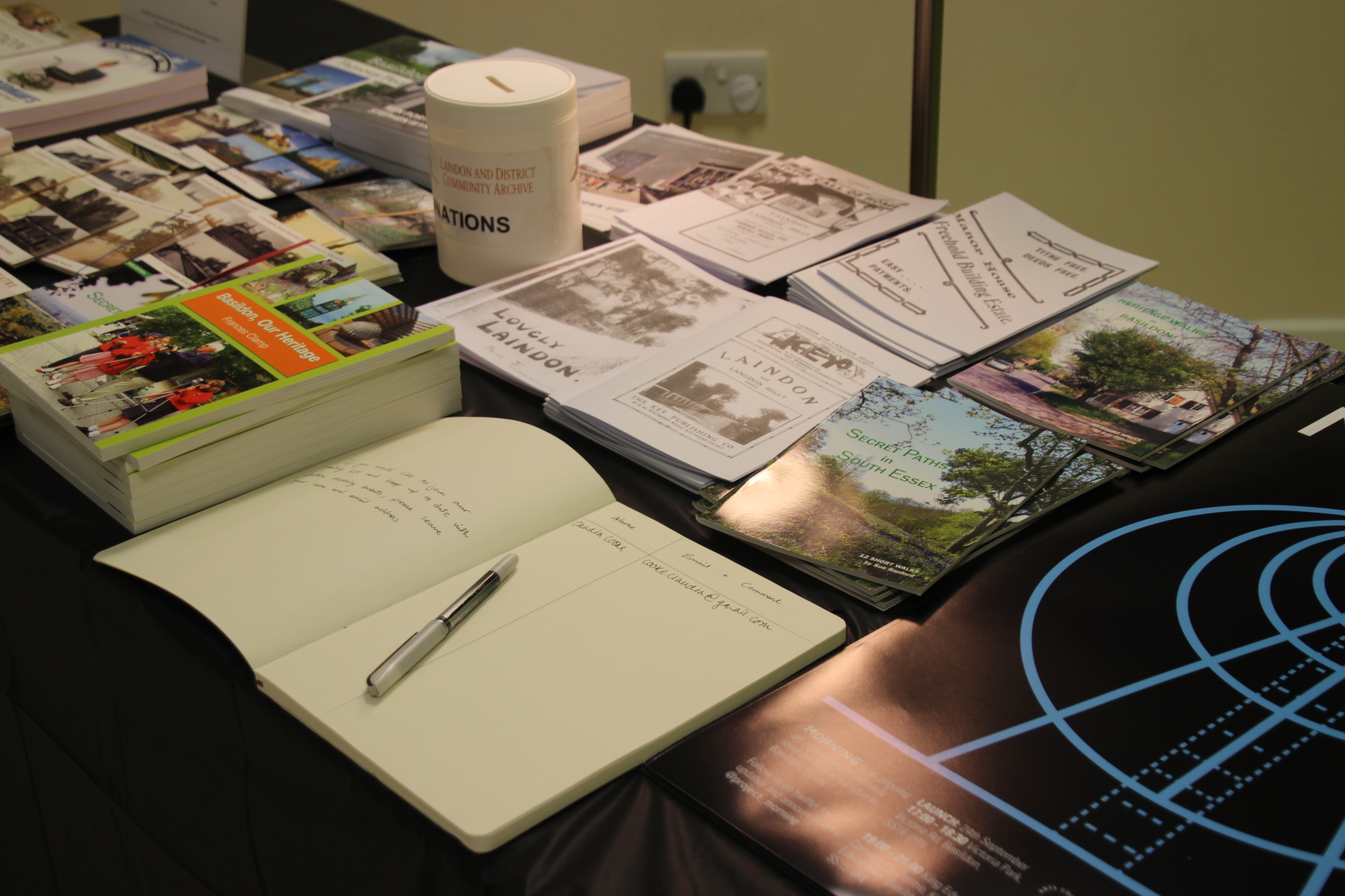Presentation of a structure built for serving drinks upon with imagery from the past, present and future Laindon alongside screen-printed T-shirts, book stall and video showreel.