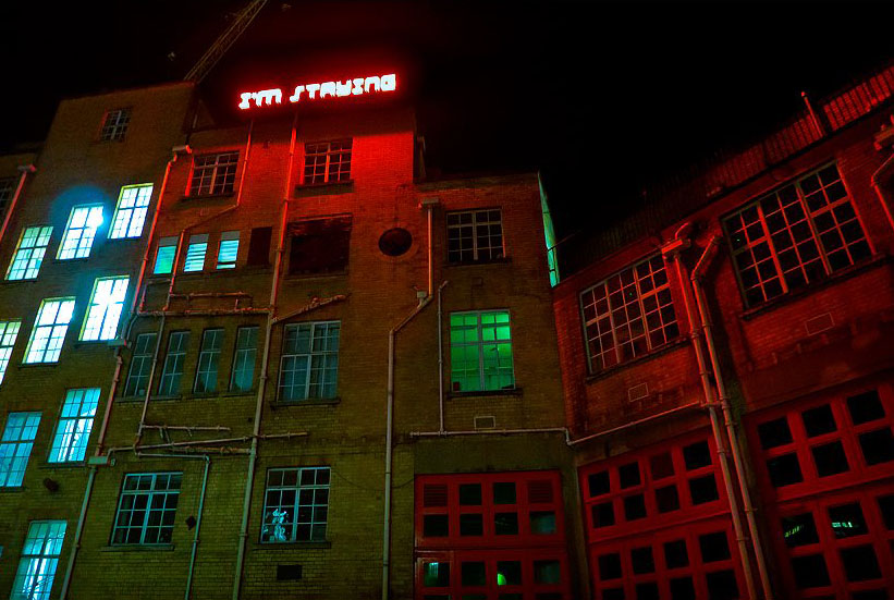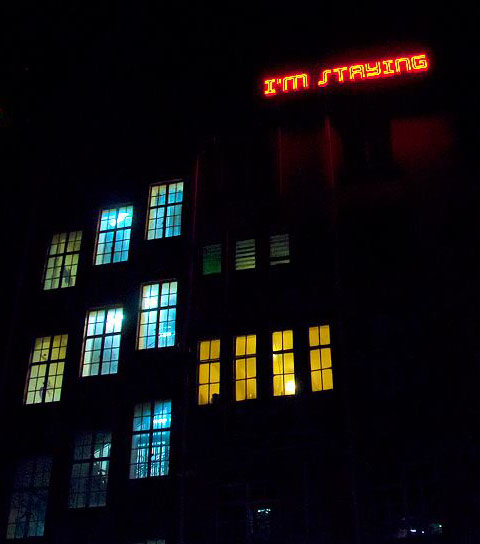 I'M STAYING was a travelling neon artwork which moved quarterly around Bristol, UK, and each location was determined by the Bristol public voting online and suggesting new locations.