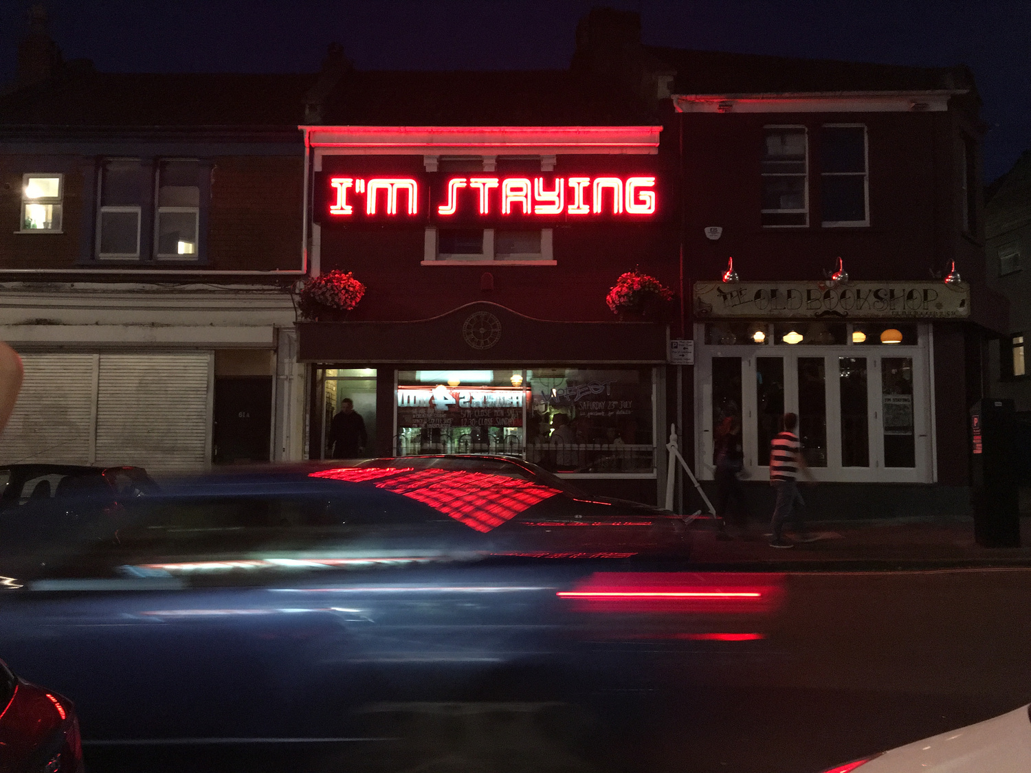I'M STAYING launched in 2014, hosted by Arnolfini, the artwork then travelled to Bristol Folk House at the launch of Bristol Biennial 2014, where it stayed until Jan 2015. I’M STAYING then travelled to Redgrave Theatre, Clifton College, Knowle West Media Centre, Hamilton House, The Island and finally The Old Bookshop were it was switched off to coincide with the launch of Bristol Biennial 2016.