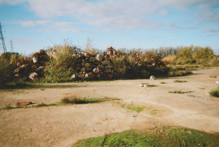Stacked into a mountain, with no immediate future use. Waiting to be trucked away, fed into a crusher, broken down to smaller fragments; to dust.